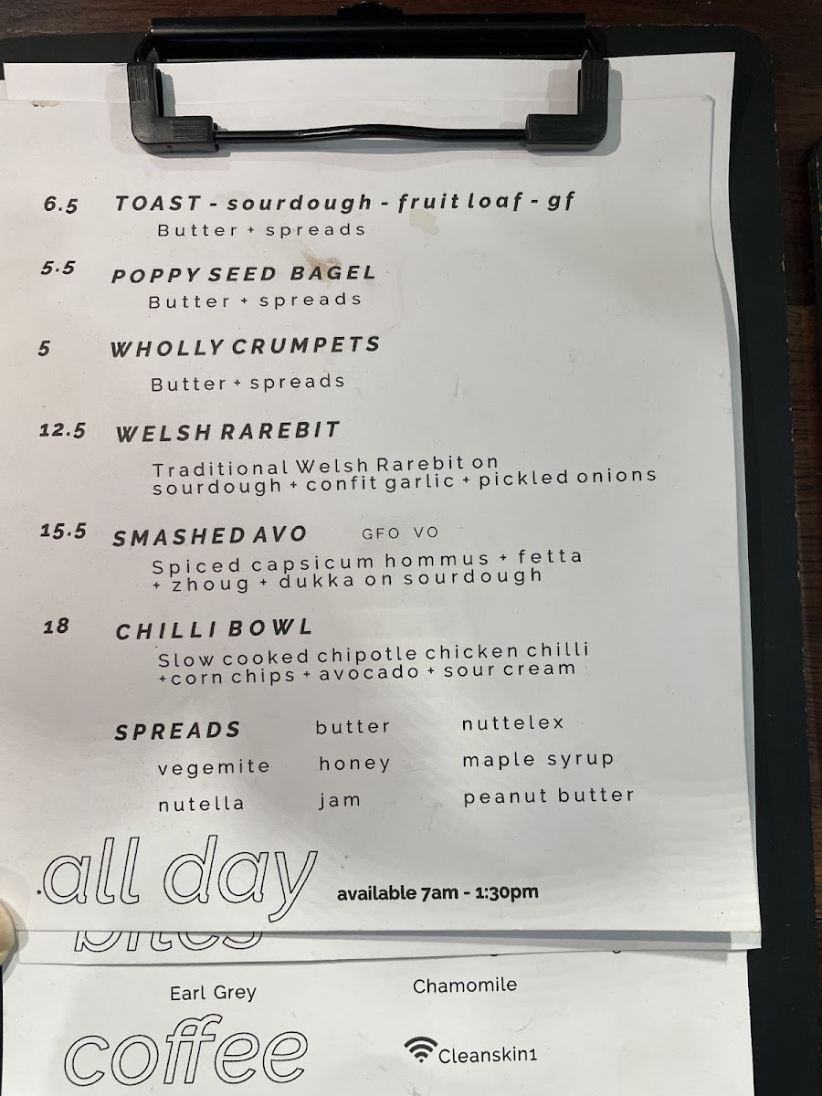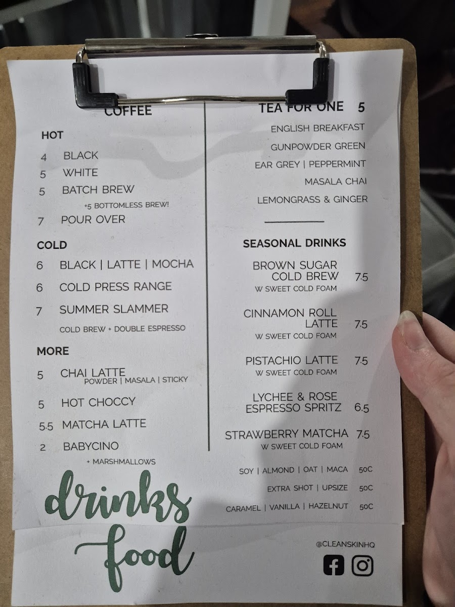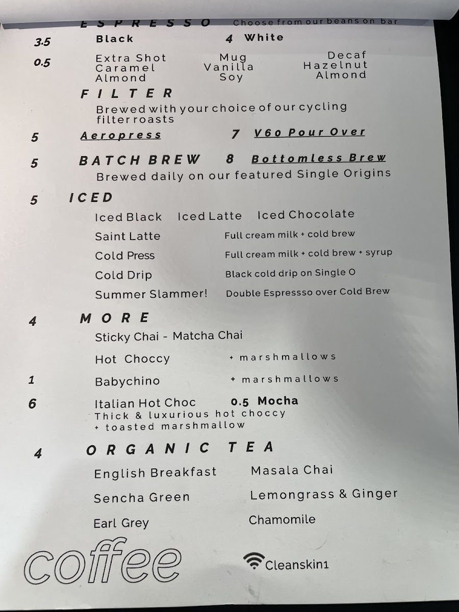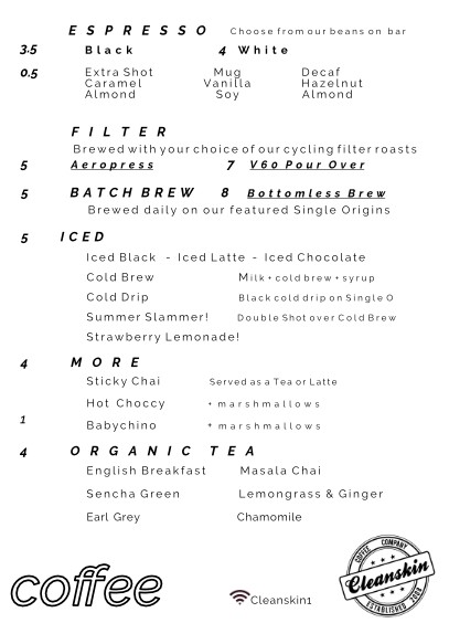 Cleanskin Coffee Co offers a diverse and inviting menu that caters to a variety of tastes. For a satisfying, savory snack, their Chicken Club toastie is a solid choice, perfect for a quick bite. The Rueben on Rye and Deli Grinder toasties provide hearty alternatives for those seeking something with a bit more flavor. When it comes to drinks, their Sticky Chai and Hot Choccy are comforting options, ideal for cooler days, while a Babychino offers a sweet treat for the little ones. For something refreshing, the iced options like Iced Black and Iced Chocolate are perfect for warmer weather, with the Saint Latte providing a unique twist. If you're in the mood for something different, try the Cold Brew or Cold Drip options, both excellent for a strong, chilled coffee experience. Organic tea lovers can enjoy a variety of selections, including the classic English Breakfast, the refreshing Sencha Green, and the aromatic Earl Grey, alongside other flavorful options like Masala Chai and Lemongrass & Ginger. For a fun and fruity option, the Strawberry Lemonade or Summer Slammer is a great pick, offering a sweet and tangy alternative to the usual beverage options.